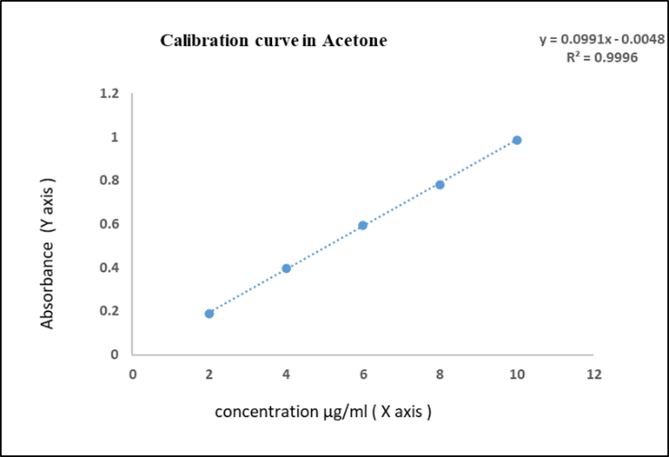 Stock solution of drug 100 mg /ml was prepared in solvent acetone. The stock solution of 100µg/ml was used to prepare different dilutions in the range of 2-10µg/ml in respective solvents. The absorbances of resulting solutions were measured at 231 nm using respective blank solvents by UV-visible spectrophotometry [10].