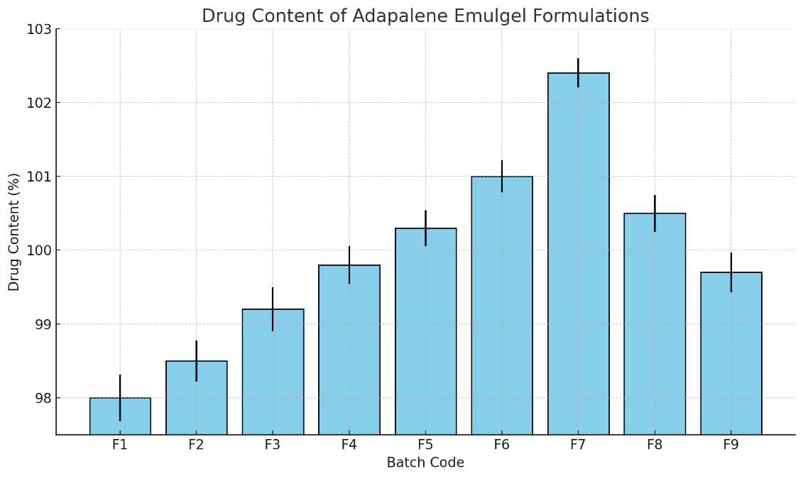 The Adapalene anti-acne emulgel was prepared using a stepwise procedure. Initially, a gel base was formed by dispersing Carbopol 934 in distilled water and allowing it to swell, while HPMC was separately dissolved and hydrated. Both were combined and mixed to obtain a homogenous gel base. For the oil phase, Adapalene was dissolved in liquid paraffin with gentle heating (60°C), and Span 20 was added as a lipophilic surfactant. Simultaneously, the aqueous phase was prepared by dissolving Tween 20, propylene glycol, and methyl paraben in distilled water, maintaining the same temperature. The aqueous phase was then added to the oil phase under continuous stirring to form a stable emulsion. This emulsion was slowly incorporated into the gel base with gentle stirring to form the emulgel. The pH was adjusted to 5.5–6.5 using triethanolamine, and the final volume was made up with distilled water. The formulation was stored in airtight containers at room temperature for further evaluation [15].