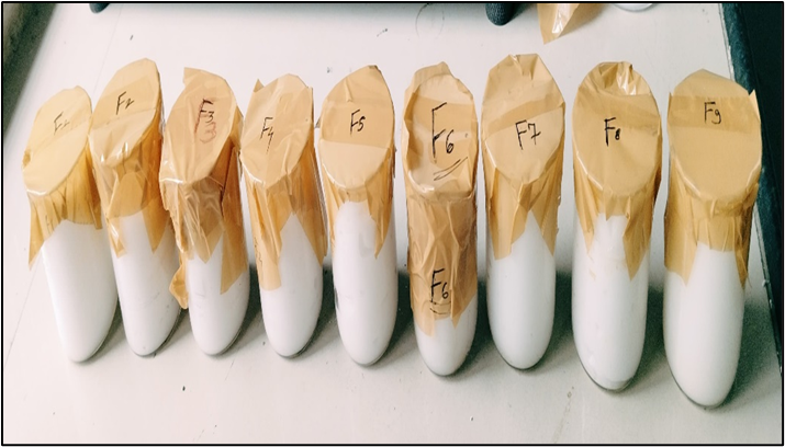In compliance with ICH guidelines, stability tests of F9 formulations examined the effects of aging on the physio-chemical properties of the emulgel formulations. Appearance, pH, drug content and viscocity were measured at one-month intervals. The evaluation criteria for the original and retained emulgel formulations did not differ substantially, according to the results. When kept at 40 ± 2°C and 75 ± 5% relative humidity, the F7 emulgel formulations did not change.
