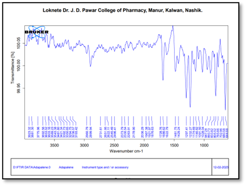 The infrared absorption spectrum of adapalene was recorded with a KBr disc over the wave number 4000 to 400 cm-1 using Fourier Transform Infrared Spectrophotometer (Agilent Technologies Cary 630, USA).