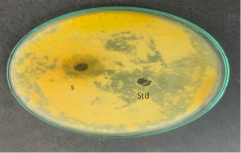 Candida albicans were inoculated on media (90 mm). Test compounds: Sample (25µl) and Standard Ketoconazole (50µl) Candida albicans were added to the 5mm well on agar plates. The treated plates with Candida albicans were incubated at 24-30°C for 24- 72 hrs. The treated plates were observed for the zone of inhibition around the wells.