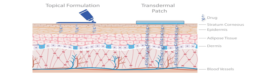 → Transdermal delivery can increase the therapeutic value of many drugs by avoiding specific problems associated with the drug e.g., gastro-intestinal irritation, low absorption, decomposition due to hepatic “first-pass” effect, formation of metabolites that cause side effects, short half-life necessitating frequent dosing, etc. They are non-invasive, avoiding the inconvenience of Parenteral therapy.