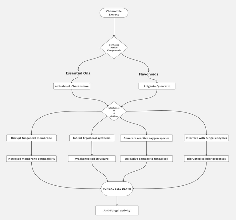 Chamomile exhibits antifungal activity through several mechanisms: