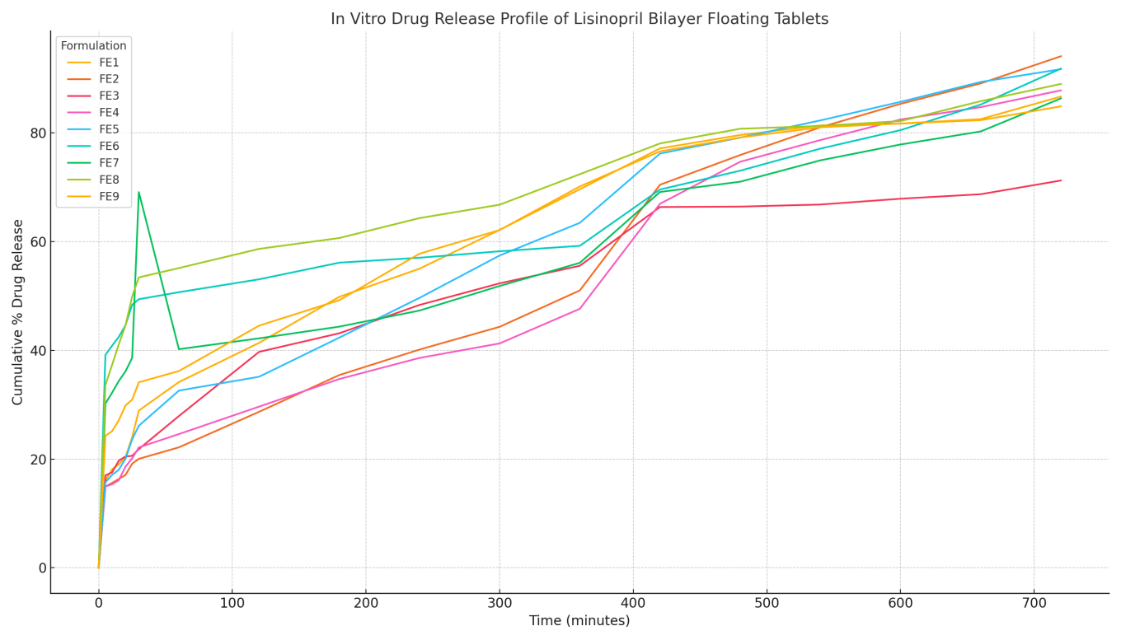 The objective of the present study was to formulate and evaluate bilayer floating tablets of Lisinopril to enhance its gastric residence time and provide sustained drug release, thereby improving its bioavailability and therapeutic efficacy. Nine formulations (FE1–FE9) were developed and subjected to comprehensive post-compression evaluations including thickness, hardness, friability, weight variation, and drug content uniformity. All formulations complied with pharmacopeial standards, exhibiting acceptable physical properties. In vitro floating studies demonstrated that all tablets had a floating lag time of less than 3.5 minutes and a floating duration exceeding 12 hours. In vitro drug release studies, performed in 0.1N HCl, revealed a controlled release pattern with cumulative drug release ranging from 86.70% to 94.12% over a 12-hour period. Among all formulations, FE8 was identified as the optimized batch, showing excellent floating behavior, mechanical integrity, and sustained drug release (89.02% at 12 hours). These results confirm the potential of bilayer floating tablets as a promising gastro-retentive delivery system for Lisinopril, ensuring prolonged drug availability and enhanced patient compliance in the management of hypertension.