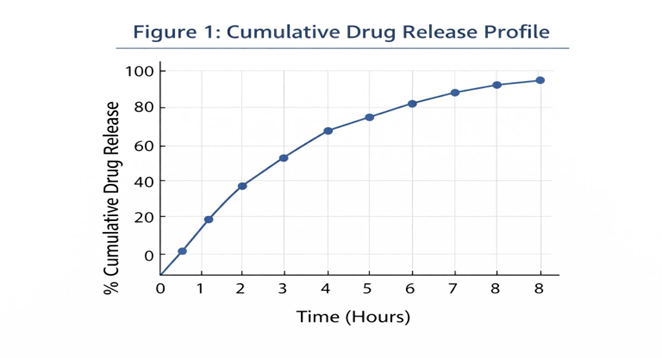 The cumulative release profile showed an initial burst (25 % in 1 h) followed by sustained release up to 91 % over 6 h (Figure 1). The release followed a Higuchi diffusion model (R² = 0.981), suggesting diffusion-controlled drug release through the polymeric matrix [101].