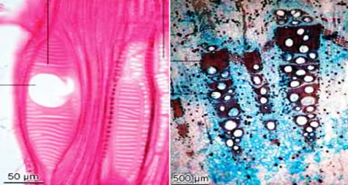 The juvenile stem's transversely sliced surface has irregular rings of vascular bundles and a rectangular contour. With three to four vascular bundles beneath the wings that are more developed than those at the flat sides, this is parallel to the epidermis' underside. This section has many air cavities and is conjoint, collateral, with a cap of bast fibers surrounded by idioblast that contains calcium oxalate cluster crystals. Except for the flat, broad side of the old stem, the entire ring of vascular strands with a well-developed cambium ring is visible.