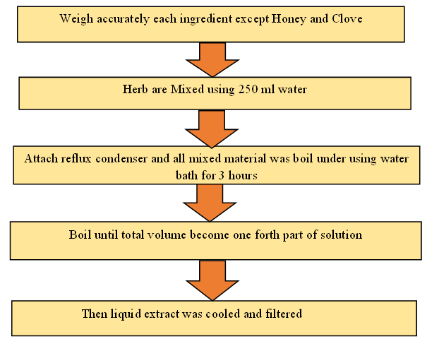 Many people have common issues of coughing. There are two types of coughs: dry cough and wet cough. Syrup is a popular form of medication for cough and cold due to its ease of use for patients. Herbal syrup is the most preferred form of treatment for cough, as it offers benefits over synthetic syrups. Herbal cough syrup is made using ingredients such as Clove, Tulsi, Cinnamon, Honey, and pudina. This unique combination of herbs is highly effective in treating cough, as well as common cold, respiratory disorders, and nasal problems. In this study, four batches of honey-based herbal syrup were prepared with concentrations of 25%, 30%,35% and 40% w/v. The quality of the final herbal syrup was assessed based on pre-formulation and post-formulation parameters including density, viscosity, pH, and various organoleptic characteristics. The current market for herbal syrups is extensive, with a growing demand for natural and herbal remedies.