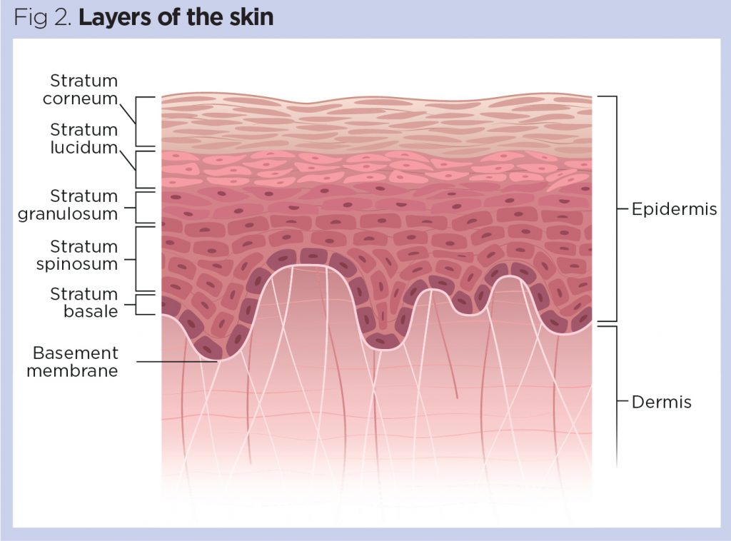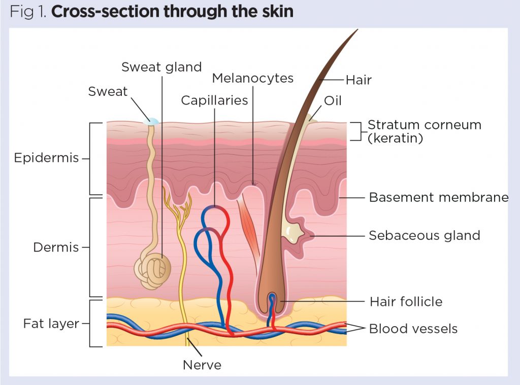 The skin is the largest human organ. It has three layers: the epidermis, the dermis, and the hypodermis. The epidermis is the outer layer, formed by a stratified, squamous epithelium composed mainly of keratinocytes and also dendritic cells (melanocytes, Merkel cells, and Langerhans cells). The epidermis is divided into four layers according to keratinocyte morphology and the degree of differentiation into cornified cells (the outermost layer is called the stratum corneum). The dermis is the middle layer, basically made up of collagen and amorphous connective tissue containing nerve and vascular networks, epidermal appendages, fibroblasts, macrophages, and mast cells. The hypodermis or subcutaneous tissue is a real endocrine organ composed of lobules of adipocytes separated by fibrous septa formed from collagen and blood vessels. The skin and its various components can communicate with other tissues and self-regulate through the production of cytokines, neurotransmitters, hormones, and their corresponding receptors. These neuro-immuno-endocrine functions are tightly networked to central regulatory systems. The skin is also a vast reserve of stem cells to rejuvenate the body surface and repair wounds. All of these structures allow the skin to perform vital functions, including protection against physical, chemical, and biological agents; prevention of excess water loss; and regulation of temperature. In addition, the skin constitutes the sensory organ for touch and environmental sensing [5]. The skin is divided into several layers, as shown in. The epidermis is composed mainly of keratinocytes. Beneath the epidermis is the basement membrane (also known as the dermo-epidermal junction); this narrow, multi-layered structure anchors the epidermis to the dermis. The layer below the dermis, the hypodermis, consists largely of fat. These structures are described below.