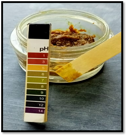 pH of the produced gel was assessed using pH paper. Scrub is lightly applied on pH paper. The pH was discovered to be between 5.5-6.5
