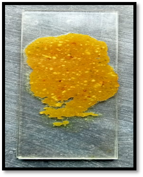 The gel that comes out of the tube behaves in a way that is greatly influenced by its spreadability. It is used to determine the extent of the gel’s spreadability on the skin. A glass slide with 100 g of Weight was placed on it above a small amount of sample that had been deposited on the slide. A Small quantity of sample was placed on a glass slide and another slide was placed above them; 100 G of weight was placed on the slide. The amount of time it took the gel to spread out on the slide was measured and determined to be 3 cm in 40 seconds. It was calculated by using following