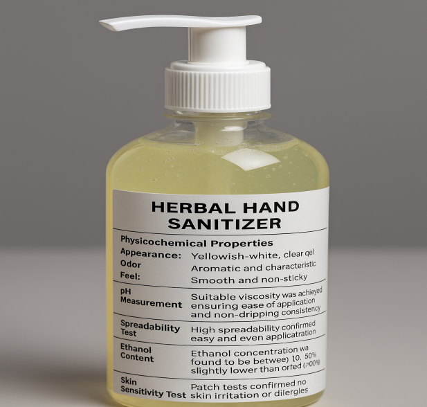 Results and Discussion: The herbal hand sanitizer exhibited good physical stability without phase separation or precipitation. The yellowish-white color, pleasant aroma, and non-sticky consistency make it user-friendly. The presence of herbal components like Neem, Tulsi, Aloe Vera, Turmeric, and Orange Oil provided antibacterial, antiviral, antifungal, moisturizing, and antioxidant effects. The slightly lower ethanol content (40–50%) suggested that while antimicrobial action is still present, optimizing ethanol concentration would further enhance efficacy against a broader spectrum of pathogens. Skin sensitivity studies confirmed the formulation to be mild and non-irritating, even upon frequent application, emphasizing its suitability for daily use.