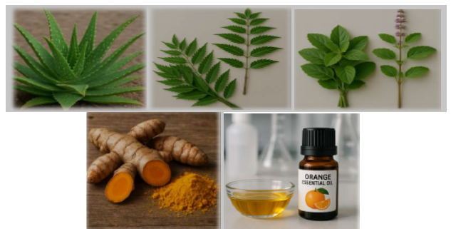 Figure no. 01: Image of Aloe Vera, Neem, Tulsi, Turmeric and Orange essential Oil.