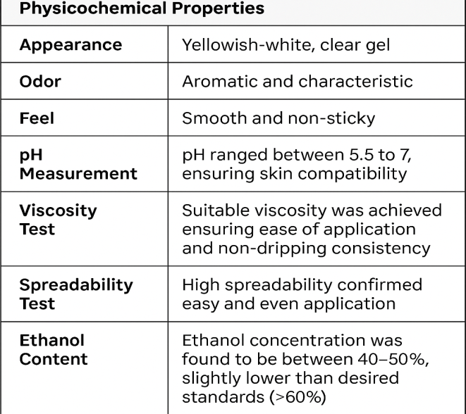 Ethanol Content: Ethanol concentration was found to be between 40–50%, slightly lower than desired standards (>60%).