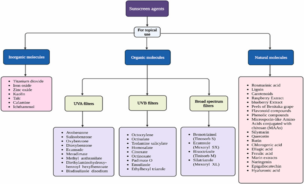 Sunscreens are usually categorized into inorganic and organic UV filter. Inorganic agents reflect and