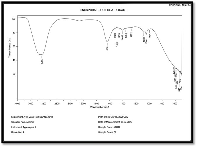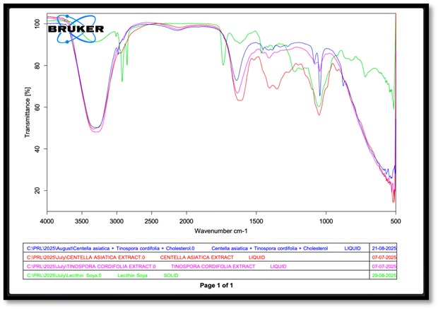 FTIR studies of herbal extracts (Tinospora cordifolia and Centella asiatica) and excipients was performed as shown in figure since, all the functional groups were intact. It was found that the drug and excipients were compatible with each other.