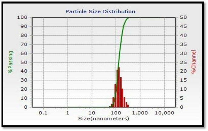 The particle size distribution graph indicates a narrow and consistent distribution within the nanometer range. The peak occurs near 100 nm, suggesting most particles are around this size. The sharp peak and steep cumulative curve imply uniform particle size and minimal aggregation. Such a distribution is ideal for applications requiring controlled nanoscale properties, such as cosmetics, coatings, or pharmaceutical formulations.