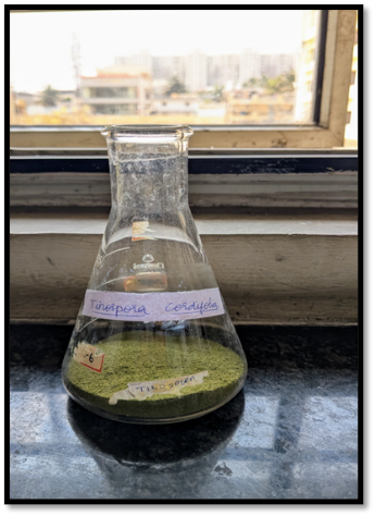 The leaves of Tinospora cordifolia were cleaned and dried into small pieces and pulverized in blender. The powder was stored in a container at room temperature. 100 g of powder was extracted using the repeated maceration method with 50% methanol (v/v) in macerator for three days. The filtrate was then filtered and evaporated using rotary vacuum evaporator. Further the extract was collected, weighed and refrigerated until further processing.12