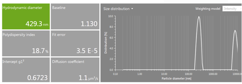 3. Particle Size: Determination of vesicle size can be carried out using zeta sizer instrument. This instrument contains Malvern PCS software. The sample must be diluted with distilled water before taking the result. The particle size must be required in nano range (10 - 3000nm).