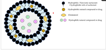 Niosomes are non-ionic surfactant-based vesicles composed of cholesterol and suitable hydration media. They are biodegradable, biocompatible, chemically stable, cost-effective, and capable of encapsulating both hydrophilic and lipophilic drugs. Due to their nanoscale size and amphiphilic structure, niosomes improve drug retention, provide sustained release, and protect active compounds from degradation. Cholesterol contributes to membrane rigidity and stability, while non-ionic surfactants enhance permeability and reduce toxicity, making niosomes suitable for topical and transdermal drug delivery.