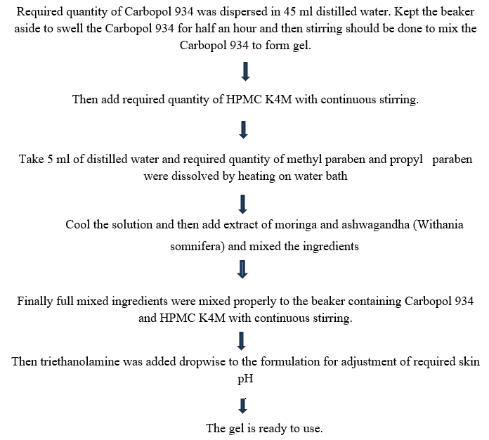 Topical gels are homogenous, semi-solid preparations used in the treatment and cure of skin conditions. Because gels are more hydrophilic by nature, the medicine or active component was released quickly. Herbal formulations mean a dosage form containing one or more herbs to give various cosmetic or therapeutical activity. In the present study, due to its antibacterial properties, moringa is helpful in preventing acne breakouts on the skin. It also helps in removing blemishes, dark spots, pimples and blackheads. While, Withania Somnifera (Ashwagandha) having anti-inflammatory and anti-oxidant properties it is used for acne treatment. Ashwagandha can help to cure hyperpigmentation by controlling the over production of melanin in the skin. Thus, it is used to remove acne scars. Hence these two trees are used for the preparation of anti-acne gel. F1 to F6 batches are prepared of the anti-acne gel. From these F4 batch is the optimized batch, since its homogeneity is very good, there is no grittiness. The F4 batch has viscosity 4470 cp, Spreadability is 16.66 gm.cm /sec. F4 batch shows moderate activity against Staphylococcus aureus which is responsible for formation of acne.