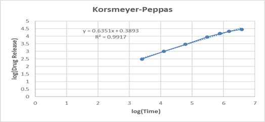 The Higuchi model (R² = 0.9906) also showed a good correlation, implying that the drug release is significantly governed by a diffusion-controlled mechanism through the polymeric matrix. Furthermore, fitting the data to the Korsmeyer–Peppas model yielded an R² of 0.9917 with a release exponent (n = 0.635). Since the value of n lies between 0.5 and 1.0, the mechanism can be characterized as non-Fickian (anomalous) transport, indicating that both diffusion and polymer relaxation/erosion contribute to the overall release mechanism.