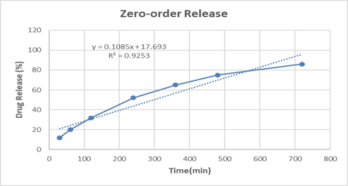 The zero-order model (R² = 0.925) showed comparatively lower correlation, indicating that the system does not follow a constant drug release pattern over time. Instead, the release is better explained by a combination of diffusion and erosion, which aligns with the biphasic nature of the polymeric film.