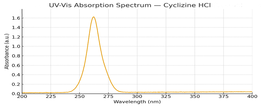A stock solution of cyclizine HCl was prepared by accurately weighing 50.0 mg and dissolving in methanol; the volume was adjusted to 50.0 mL in a volumetric flask to yield 1000 µg/mL. The UV spectrum of the stock (200–300 nm) was scanned on a Shimadzu UV 2450 to determine the λmax. Working standards (2, 4, 6, 8, 10 µg/mL) were prepared by appropriate dilutions of the stock in methanol using calibrated pipettes and volumetric flasks; solutions were filtered (0.45 µm) prior to measurement. Absorbance of each standard (n=3) was measured against a methanol blank in quartz cuvettes at the determined λmax. A calibration curve was constructed by plotting concentration (µg/mL) versus mean absorbance (Y) and linear regression used to calculate slope, intercept.8