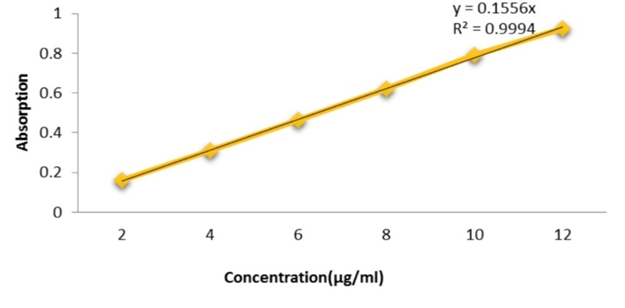 The lambda max of the Diclofenac sodium was found to be 320nm. After the determination of lambda max the calibration curve and absorption are to be evaluated by the UV spectroscopy. The results of the absorption and concentration were given below in the Table 2. Standard graph of diclofenac sodium are shown in Figure 2.