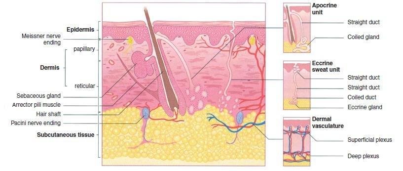 Dermis: The skin's main layer is called the dermis. Blood vessels, lymph vessels, hair follicles, sweat glands, collagen bundles, fibroblasts, nerves, and sebaceous glands are all found in the dermis. The kind of protein that holds the dermis together is called collagen. This layer gives the skin strength and suppleness. The dermis also contains touch and pain receptors.