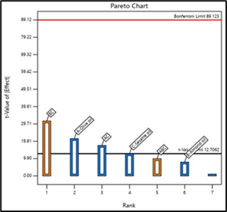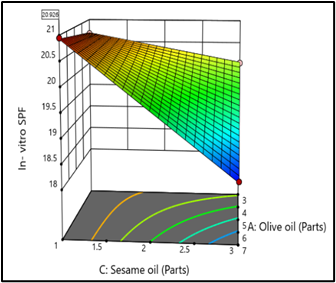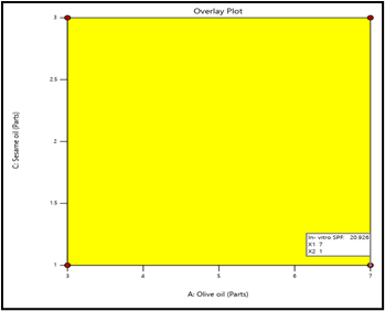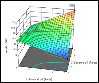 Optimization of oil ratio: Considering the data given by Pareto chart, ANOVA table, Coded equation, 2D Contour plots and 3D Surface response plots we observe that factor A, interaction factor AC and interaction factor BC significantly affect the In- vitro SPF value. Effect of factor A i.e. Olive oil and interaction factor AC (Olive oil and Sesame oil) is Negative. This means that with an increase in the amount of Olive oil in the formulation, in- vitro SPF will reduce. However, the coefficient of factor A in the coded equation is small. This signifies that though an increase in the quantity of Olive oil will reduce SPF, this reduction will not be drastic. Interaction factor AC will also reduce SPF but as indicated by its small coefficient, reduction will not be drastic. When we observe the 3D Surface Response plot for AC factors, we can clearly observe that, as the quantity of Olive oil increases (with constant quantity of sesame oil), significant reduction in SPF is not observed. However, with increasing quantities of Sesame oil, SPF is drastically reducing. Thus, highlighting the need to minimize the quantity of Sesame oil to achieve maximum SPF. This also becomes evident through the negative coefficient associated with factor C, Sesame oil. The effect of interaction factor BC is Positive and largest amongst other factors. This means that interaction between Almond oil and Sesame oil is improving SPF. However, this positive trend is not observed throughout the concentration range of Almond oil and Sesame oil, after a certain concentration trend is getting reversed. Further increase in quantity of both oils is reducing SPF. The optimized oil ratio recommended by StatEase software is 7: 1: 1 for olive oil: almond oil: sesame oil to achieve maximum in- vitro SPF. High amount of Olive oil is acceptable due to minimum SPF reduction. Low amount Sesame oil is essential to minimize its strong negative effect on SPF. A low amount of Almond oil will avoid mild negative effects and will also preserve the beneficial effect of interaction factor BC.