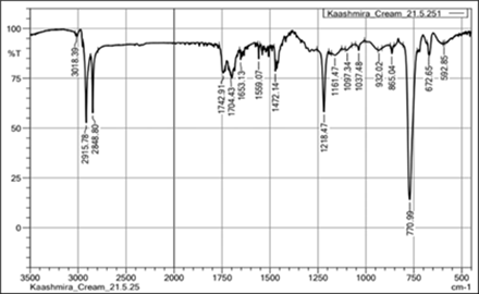 SI and PF were kept for Stability studies under Accelerated conditions, 40? and 75 % RH for a duration of 45 days. Samples of both were collected periodically and analyzed. The FTIR spectrum of samples taken on day 1 and day 45 were compared, to comment on content of AA and OE in formulation. For that purpose, a small quantity of sample was solubilized in Chloroform and spread over a blank KBr pellet, then FTIR spectrum was recorded.