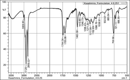 Peaks specifically shown by AA and OE were retained in the FTIR spectrum after 45 days of accelerated stability studies, suggesting that AA and OE are present in considerable quantities in the formulation even after exposure to stress conditions.