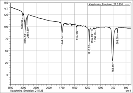 FTIR spectra of PF samples kept for accelerated stability studies were recorded on Day 1 and Day 45. FTIR spectra of PF were studied to ensure that AA and OE are present in the sample, sufficient to develop characteristic peaks. Given below are the FTIR spectra of samples,