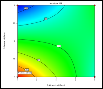 Using 23 Factorial design ratio of olive oil: almond oil: sesame oil was optimized, so that maximum SPF can be achieved. Output factor/ Response was in- vitro SPF. Input factors with their levels are summarized below,