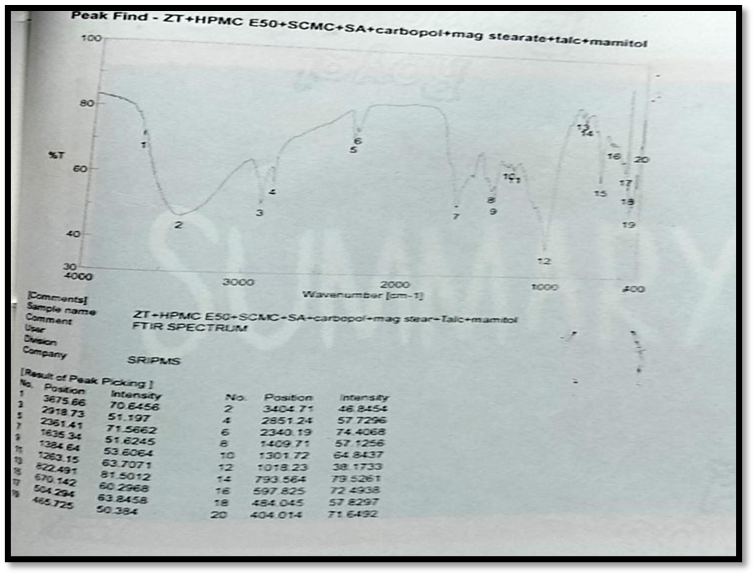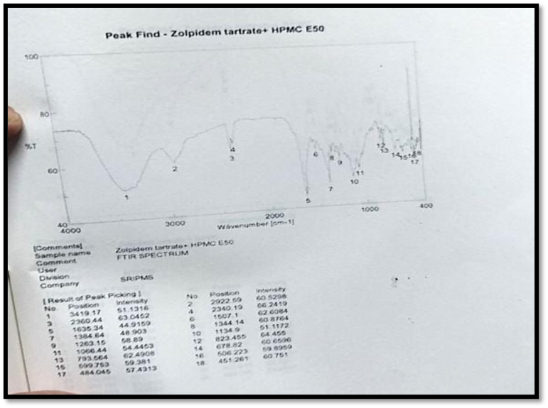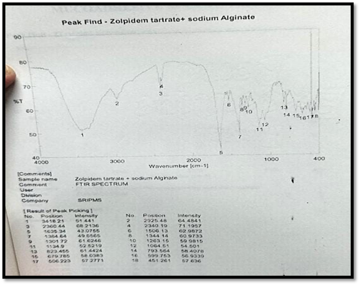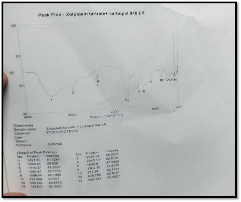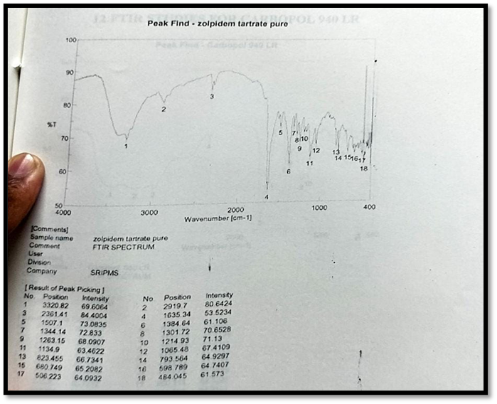 3320.82cm¯¹ C-H stretching, 1635.34cm¯¹ C=o stretching, C=N stretching1214.93cm¯¹ tertiary amine group, 793.56cm¯¹C-H bending, 1384.64cm¯¹ C-H bending in aromatic ring, there was no significant difference in the FTIR spectra of pure drug zolpidem tartrate and the formulations.
