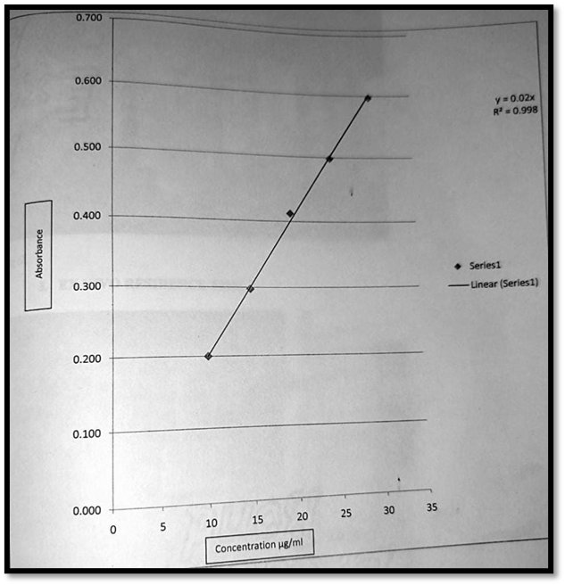 From the first stock solution a series of 1ml, 1.1ml, 1.2ml, 1.3ml, 1.4ml, 1.5ml, 1.6ml, 1.7ml, 2ml, 2.5ml, 3ml were pipetted out into separate 100ml volumetric flask and volume was made with 0.0IN HCl to get 10ug/ml-30ug/ml respectively