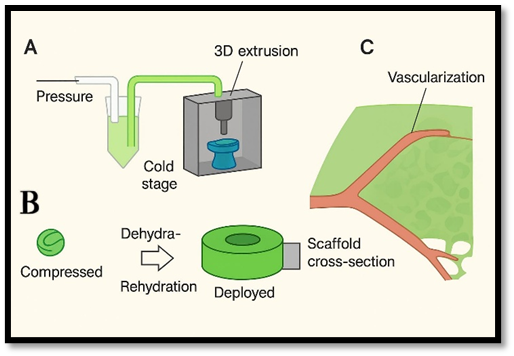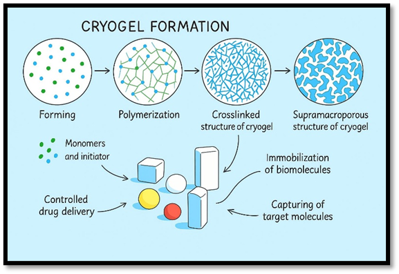 Cryogels are advanced materials used in biomedical research because of their sponge-like structure, strength, and ability to work well with water and living cells. They are better than regular hydrogels for supporting cell growth and can be made from safe, biocompatible materials. [47] Cryogels can be modified after making them to improve how they interact with cells or capture specific substances, making them useful in tissue engineering, purification, and bioreactors. They can hold cells inside them, which can make the structure stronger and speed up pore formation. Cryogels also help with detecting diseases, isolating stem cells, and studying viruses and cells. Because they are elastic and have shape memory, they can be reused, stored dry, and return to their original shape when rehydrated. New uses include 3D printing, injectable therapies, drug delivery, and wound healing. [48,49]