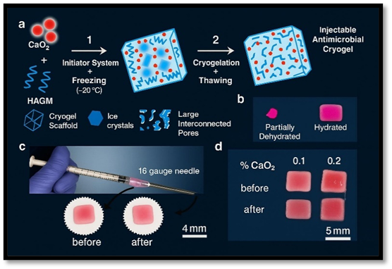 Figure 3: Schematic representationof the entire process involved in forming injectable cryogels [35] a) Cryogelation using HAGM and CP at −20 °C; b) Dehydrated vs. doused cryogels; c) Cryogels ahead and after injection through 16 G needle; d) CP remains encapsulated post-injection.