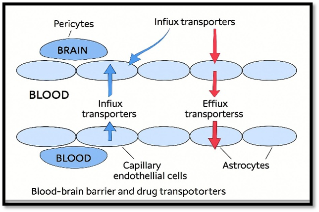 The brain uses efflux transporters (like P- glycoprotein( P- gp) and BCRP) to push out dangerous or redundant substances, including some medicines. These transporters are set up in the BBB and BCSFB and act like a pump. They use energy to shoot substances out of the brain, which can make it hard for drugs to stay outside. In some brain conditions like epilepsy and cancer, these transporters are more active, making the brain resistant to numerous medicines. [8- 11]