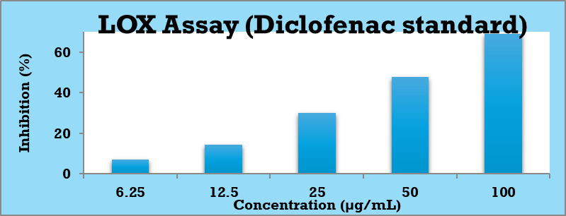 The graph shows that diclofenac inhibits LOX activity in a dose-dependent manner, with about 50% inhibition around 25 µg/mL, confirming its effectiveness as a standard anti-inflammatory inhibitor.
