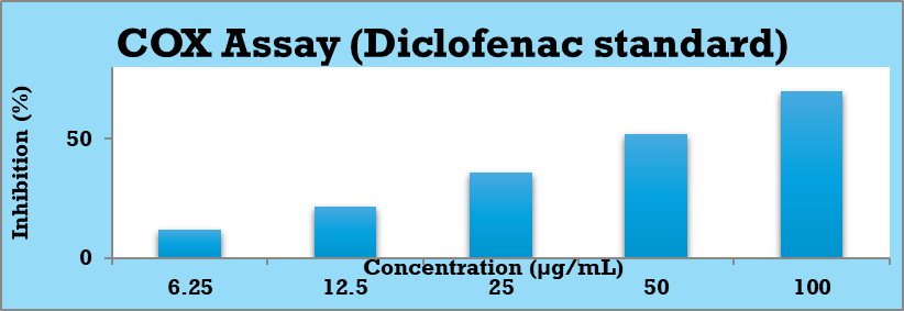 The graph shows a dose-dependent increase in COX inhibition by diclofenac, from very low inhibition at 6.25 µg/mL to almost complete inhibition at 100 µg/mL. The linear dose–response curve (R² = 0.973) confirms good assay reliability, and diclofenac serves as a standard for validating the assay and estimating IC?? values.