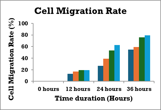 A straight scratch was made on the cell monolayer using a sterile 200 µL pipette tip. Cells were washed once with culture medium to remove debris and fresh medium was added. Scratches of similar width were maintained in all wells. Reference marks were made near the scratch to capture the same field during imaging. Initial images were taken using a phase-contrast microscope. Plates were incubated at 37 °C, and images were captured at 0, 12, 24, and 36 h until the scratch was closed. Final images were taken by aligning the same reference points.Cell migration analysisImages were analysed using ImageJ software. The percentage of wound closure was calculated by comparing the wound area at different time points with that at 0 h. Increased wound closure indicated enhanced cell migration and wound healing activity.