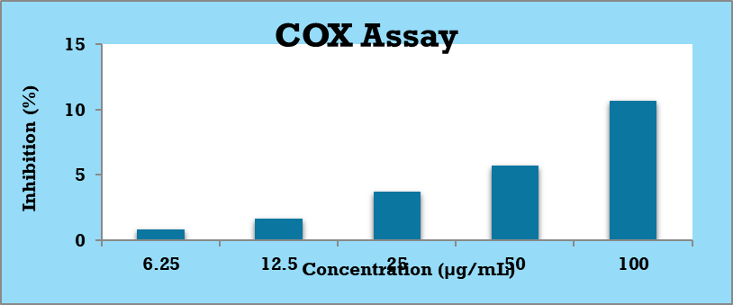 RAW 264.7 cells obtained from NCCS, Pune, were cultured to 70% confluence and stimulated with lipopolysaccharide (LPS, 1 µL of 1 µg/mL). The LPS-activated cells were treated with different concentrations of the test sample and incubated for 24 h. After incubation, cell lysates were collected and used for COX anti-inflammatory analysis.