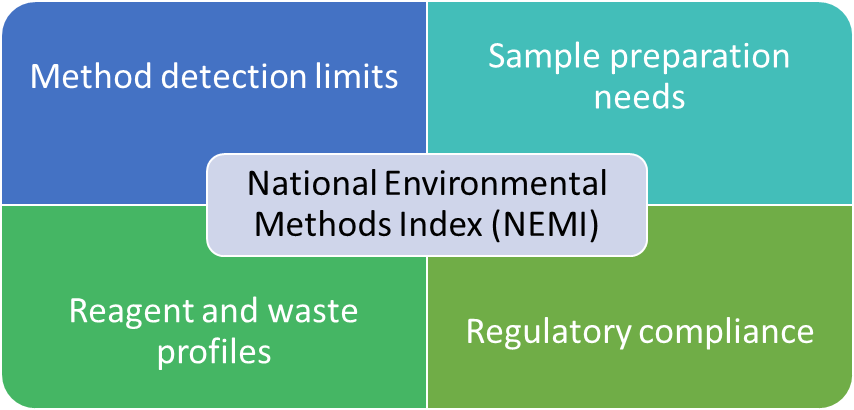 Launched in 2002, the National Environmental Methods Index (NEMI) is a searchable database developed by the US Geological Survey (USGS) and the EPA. NEMI offers a platform to compare: