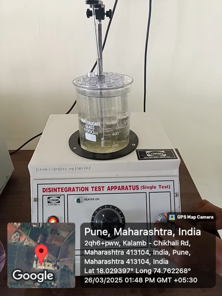 The tablet breaks down into smaller pieces during disintegration, which is the initial stage of dissolution. While most tablets have a maximum disintegration duration of thirty minutes, USP uncoated tablets have a normal disintegration time of as like as five minutes. The USP/NF (1980) method was employed. For every tablet, 900 Millilitres of disintegration the media were used in the experiment. Six tablets were chosen, put into each of the basket’s cylindrical tubes, and the disc was used. It was noted how long it took for each tablet to disintegrate into tiny pieces and escape through the mesh. A mean integration time calculation was made.