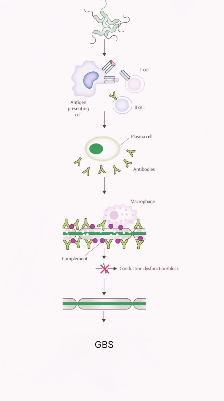 Guillain-Barré Syndrome (GBS) is an uncommon autoimmune neuropathy in which the immune system erroneously targets components of the peripheral nervous system, leading to muscle weakness and sometimes paralysis. This attack disrupts nerve signals, causing symptoms like numbness, tingling, muscle weakness, which can progress rapidly. Guillain Barré syndrome is also known as “Landry’s paralysis”. The syndrome was first recognized during world war I by Guillain, Barré and Strohl, who observed acute paralysis accompanied by elevated cerebrospinal fluid (CSF) protein without corresponding pleocytosis . The disease typically follows an infection, trauma, or vaccination and is characterized by symmetric weakness and hyporeflexia or areflexia. GBS is likely to be seen in SARS-CoV-2 post-infectious patients based on ongoing investigations. Due to its rapid progression, early recognition and prompt initiation of therapy are essential for a favorable outcome. [1][2][3]