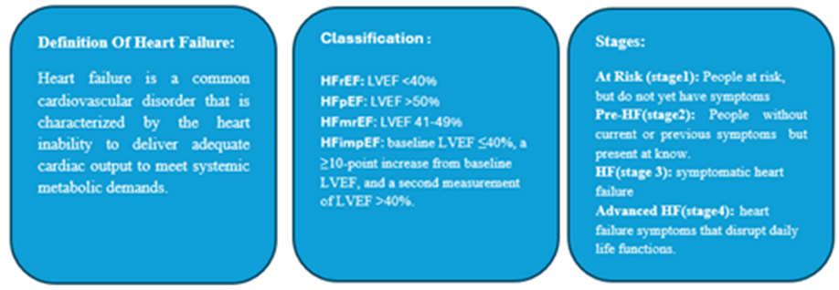 Heart failure a common cardiovascular disorder which is characterized by heart inability to deliver adequate cardiac output to meet systemic metabolic demands or as a consequence of reduced cardiac pump function2. Despite advances in cardiovascular medicine, it is associated with more hospitalization rates, impaired life quality and premature death worldwide. Heart failure a heterogeneous syndrome that is classified according to left ventricular ejection fraction (LVEF) into heart failure with reduced ejection fraction (HFrEF) and heart failure with preserved ejection fraction (HFpEF)2.