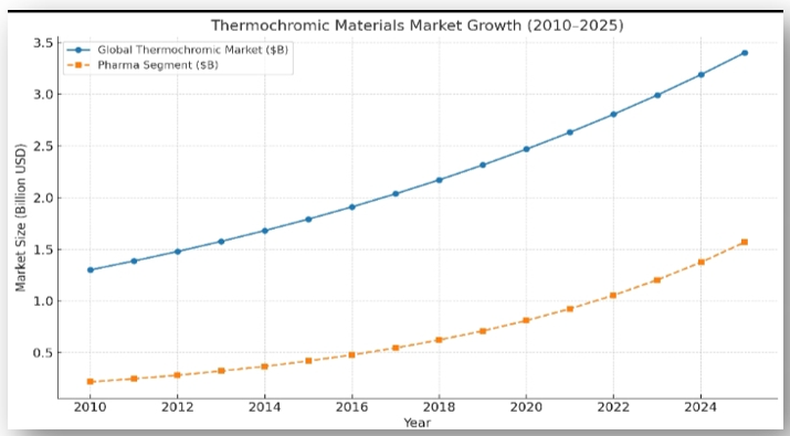 The market size of thermodynamic materials in pharmaceutical industry has been growing since 2010. According to report by marketstandmarkets, global thermochromic materials market size was valued at $1.3 billion in 2010 and is expected to reach $ 3.4 billion by 2025 , the market size of 14 Thermochromic materials in pharmaceutical industry has grown by $ 1.35 billion representing a compound annual growth rate of 14.1 %5.