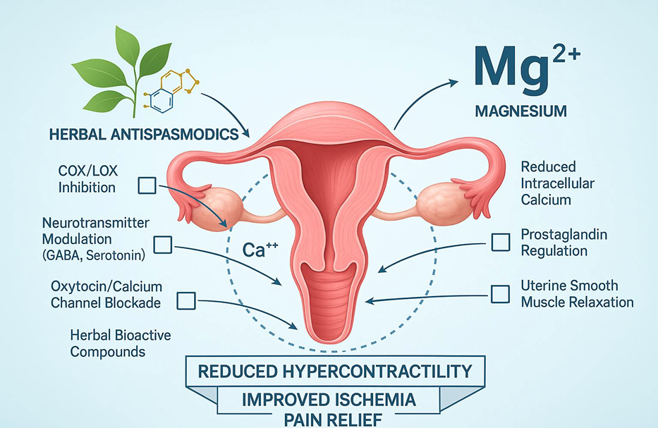 The simultaneous use of herbal antispasmodics and magnesium creates a synergistic and multi-faceted approach to address primary dysmenorrhea. Each element offers unique pharmacodynamic effects that, when combined, may deliver better therapeutic results with fewer adverse effects compared to traditional NSAIDs.