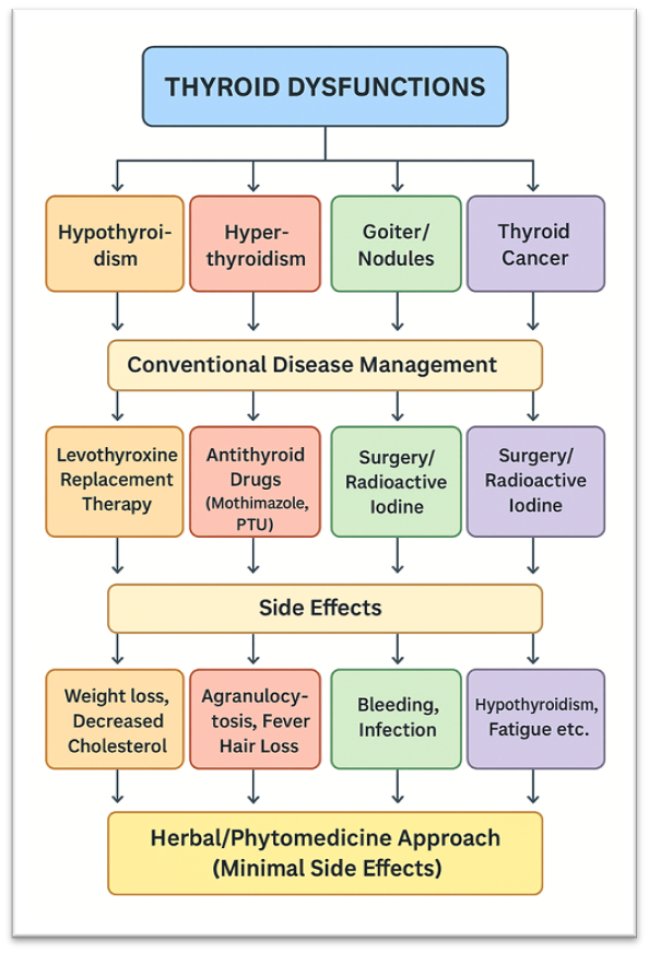 Fig.1. A representative diagram depicting various thyroid disorders, standard treatment methods with their associated side effects, and a comparison with herbal medicine-based approaches.